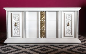 Although a large portion of her business consists of customers bringing in pieces to be painted, she also offers pieces that she’s sought out from all over the country. When a customer has a dresser he or she wants customized, for example, The Resplendent Crow arranges for pickup. When the piece makes it to the warehouse, Bhide and her six team members take it apart, setting the hardware aside. They sand the piece down, scuffing the surface up enough to the point where it can easily be primed. After a few coats of primer, they fix any dings and imperfections with filler. From there, the piece receives three to five coats of lacquer. Gloss finishes are what The Resplendent Crow is known for, but Bhide and her team can also do satin and matte sheens on pieces. The process takes about three to four weeks, and the finished pieces sell for an average of approximately $1,500.