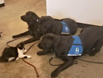 Now 1 year old, the cat spends his days lovingly tormenting the organization’s dogs in training, playfully swatting their noses and lounging on top of their crates. When the dogs are in the training rooms, D-O-G comes with. While six or seven dogs practice their “down,” the cat will meander around them and play with toys in front of them.